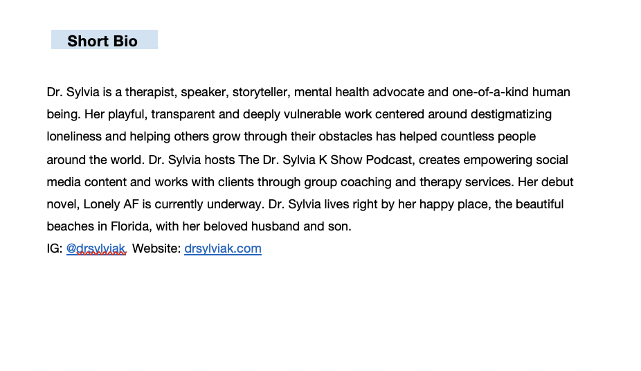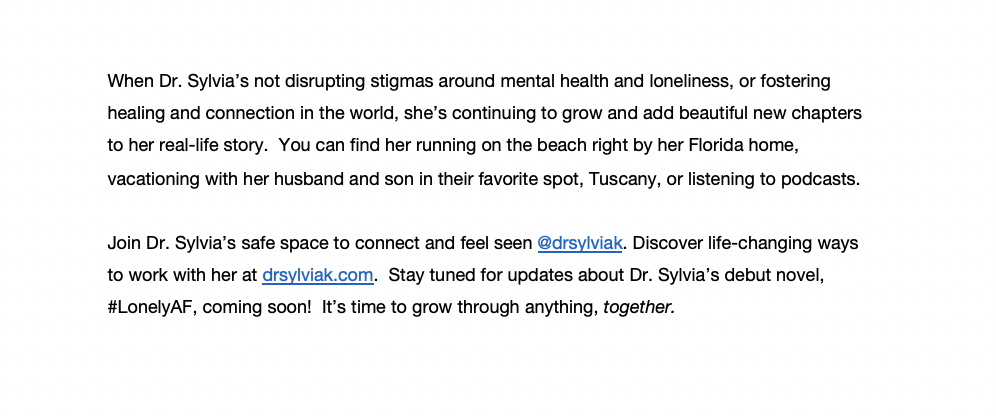 Dr. Sylvia K is a licensed therapist, podcast host, author and speaker transforming the way we talk about mental health and loneliness.