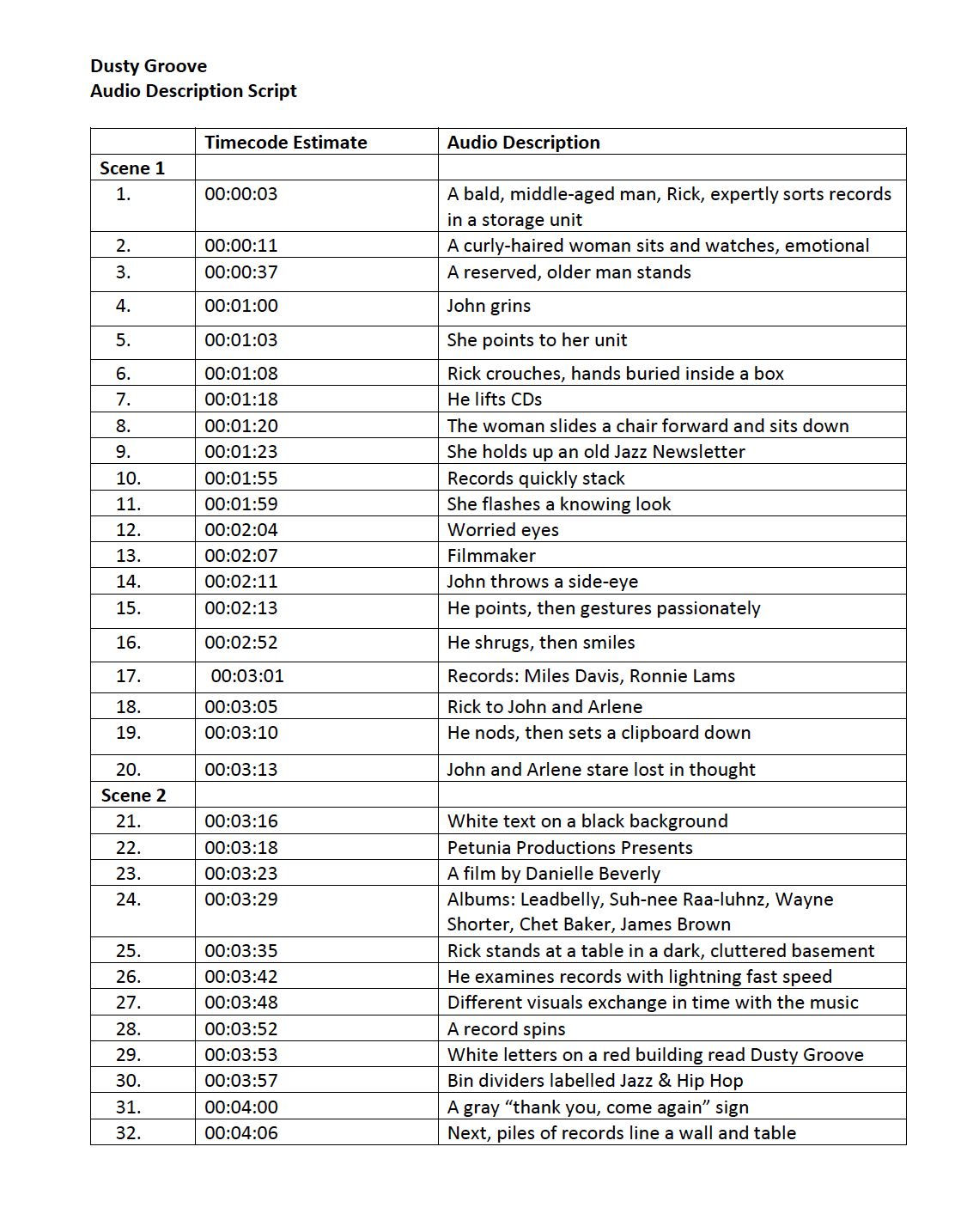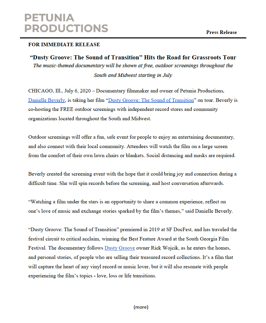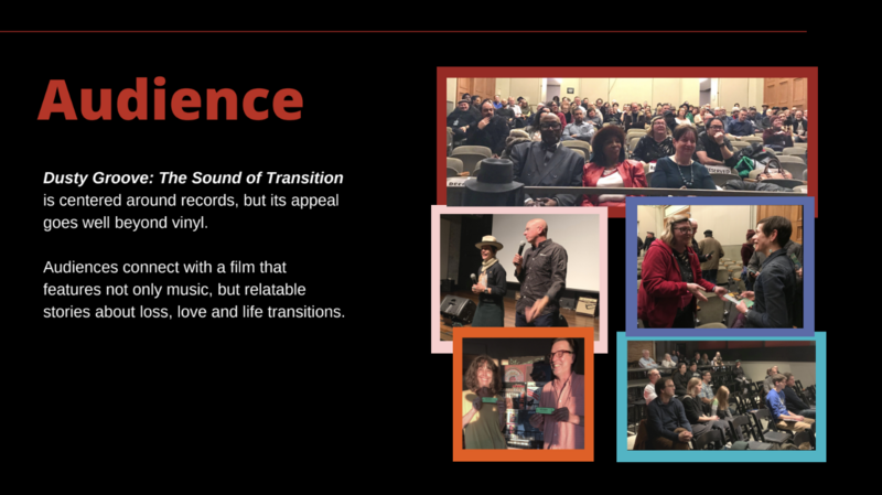 The Need: The Dusty Groove team needed a pitch deck and press release in order to pursue grants and screening opportunities. They also wanted to make their media inclusive and accessible with an audio description script and voice-over for the visually impaired.