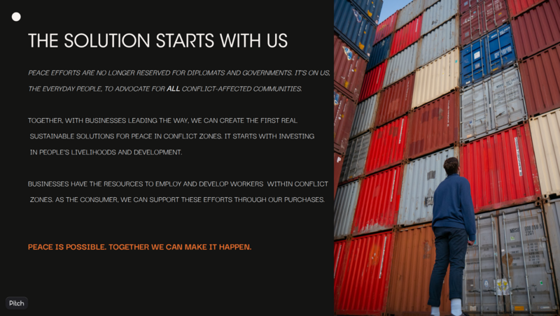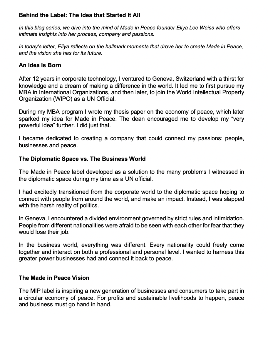 The Need: The Made in Peace founders, and their supporting ad agency Whip Creative, were seeking a writer and strategist to help legitimize the Made in Peace start-up and appeal to investors.