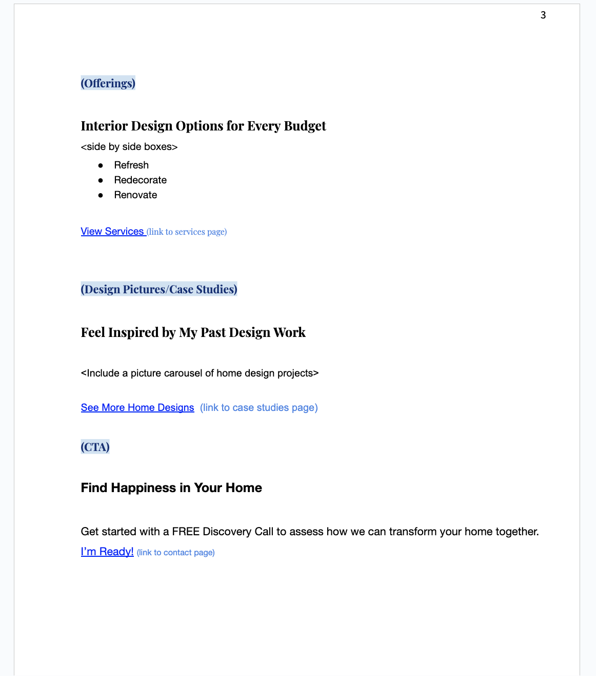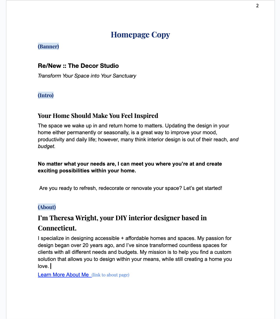 The Solution: I worked closely with Theresa to deeply understand the interior design process and define her brand, services and voice via copy so she had a strong foundation to launch her business.
